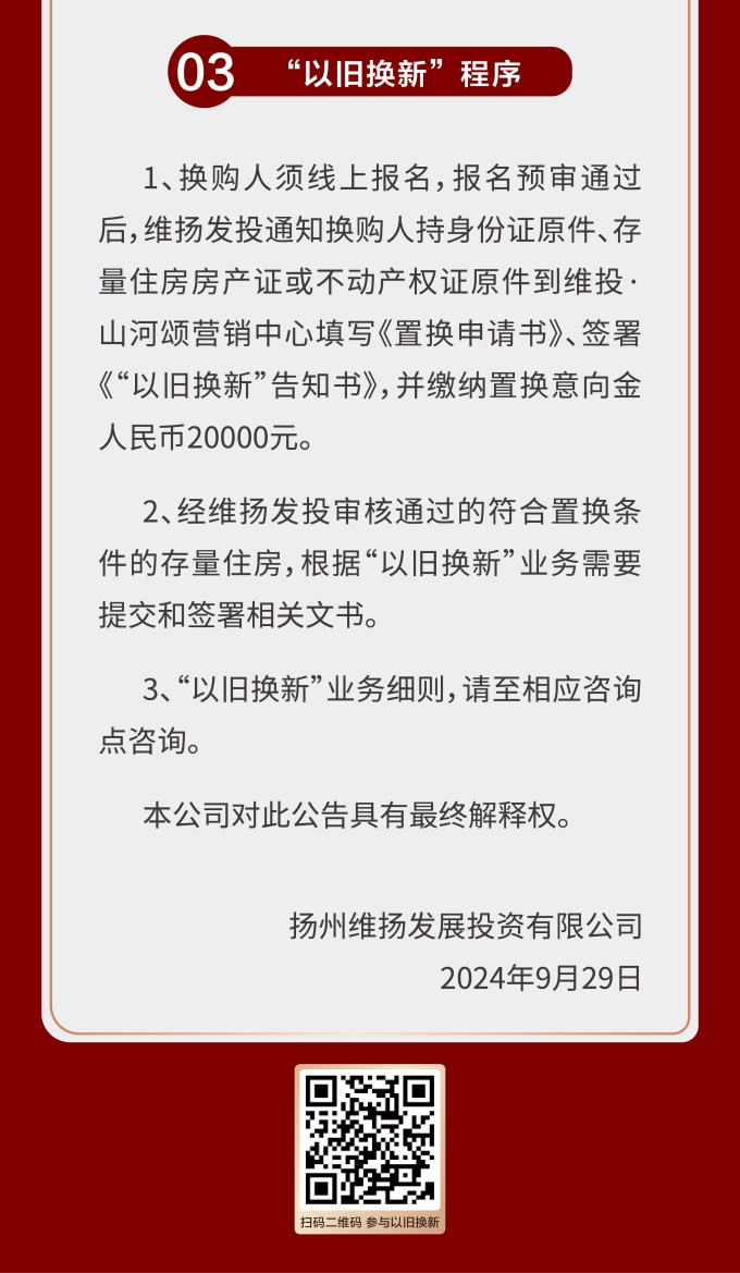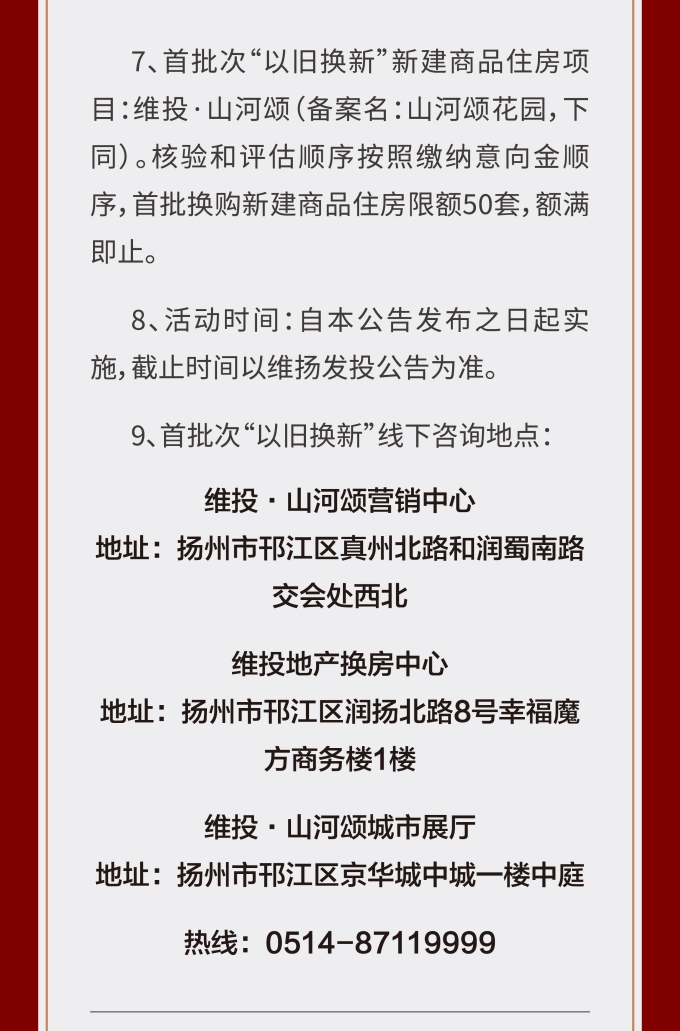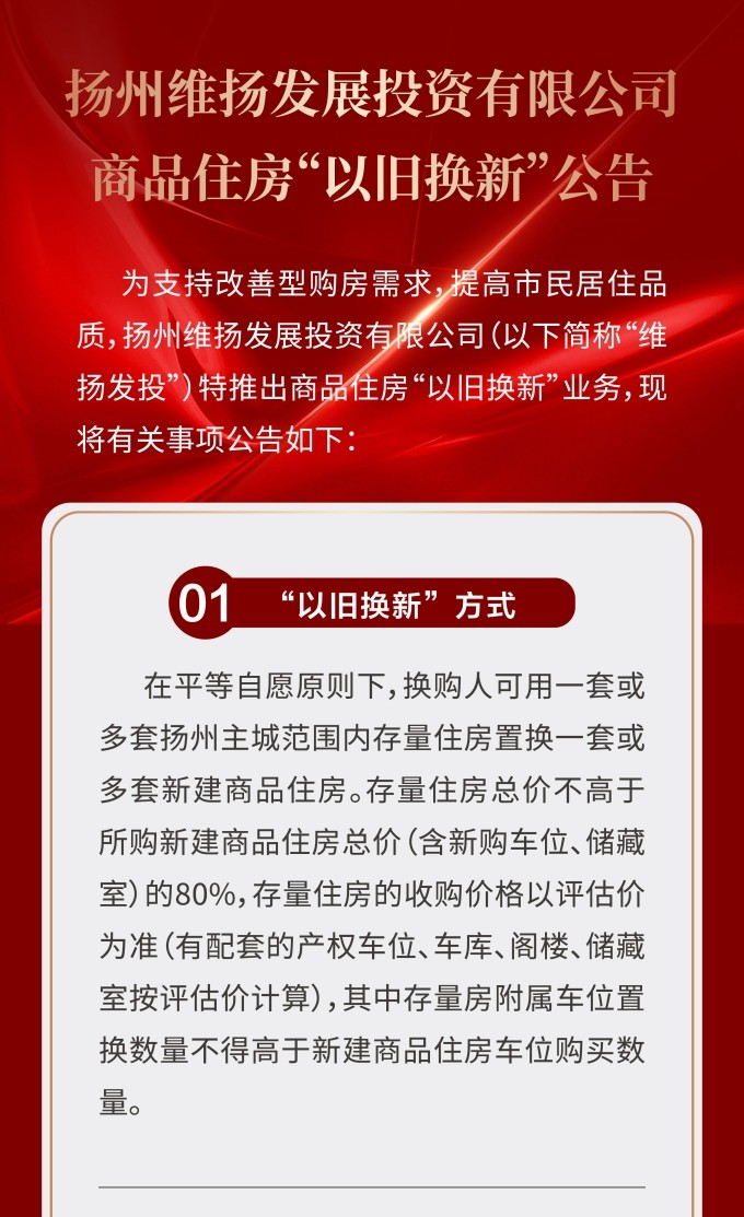 維揚(yáng)地產(chǎn)積極響應(yīng)政府新推行的“以舊換新”政策,踐行“惠民”理念,打造高品質(zhì)住宅,滿足揚(yáng)州人民改善型住房需求。此次維揚(yáng)發(fā)投“以舊換新”工作以其自主開發(fā)的維投·山河頌項目為試點(diǎn),由國企背書、置換范圍廣、全流程專業(yè)服務(wù)。首批換購新建商品住房限額50套,換購人可通過登錄“維揚(yáng)發(fā)投商品住房‘以舊換新’線上報名系統(tǒng)”報名,具體要求詳見公告。